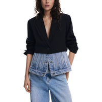 Entdecken Sie den Desigual AME_VIRGINIA 25SWEW28 Damenblazer, ein kultiges Stück, das Eleganz und Originalität vereint. Dieser Blazer hat ein einzigartiges Design mit einem taillierten Oberteil und einem auffälligen Denim-Einsatz am unteren Ende, wodurch ein trendiger Lageneffekt für diejenigen entsteht, die gerne auffallen. Das hochwertige Mischgewebe (45% Baumwolle, 36% Polyester, 17% Viskose, 2% Elastan/Lycra) bietet Komfort, eine schmeichelhafte Passform und angenehmen Stretch für Bewegungsfreiheit. Perfekt für lässig-schicke Looks, lässt es sich problemlos mit Hosen oder Röcken kombinieren und sorgt für stilvolle Outfits zu jeder Jahreszeit.