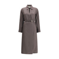 Das FF Seidenjacquard-Kleid von Fendi ist ein Meisterwerk aus raffinierter Eleganz und ikonischen Details. Es ist aus Jacquard-Seide mit dem berühmten dunkelbraunen FF-Karomuster gefertigt und verfügt über einen hemdartigen Kragen und Manschetten, die dem fließenden Design Struktur verleihen. Die überschnittenen Schultern und die Tropfen am Halsausschnitt verleihen ihm einen Hauch von sanfter Weiblichkeit, während der asymmetrische Kreuzverschluss mit kleinem seitlichen Knopf die Silhouette auf originelle Weise betont. Der passende Gürtel mit FF-Schnalle rundet den Look ab und sorgt für einen raffinierten Wiedererkennungseffekt.