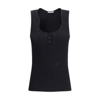 Ferragamo's ribbed top is an elegant and understated piece, ideal for those seeking a sophisticated yet casual style. The rounded neckline adds a delicate touch, while the three-button closure on the front is a practical and stylish detail. The iconic embroidered logo on the front subtly represents the brand, adding a distinctive element without being over the top. The ribbed knit top offers a comfortable fit and can be worn with both casual and more formal looks.