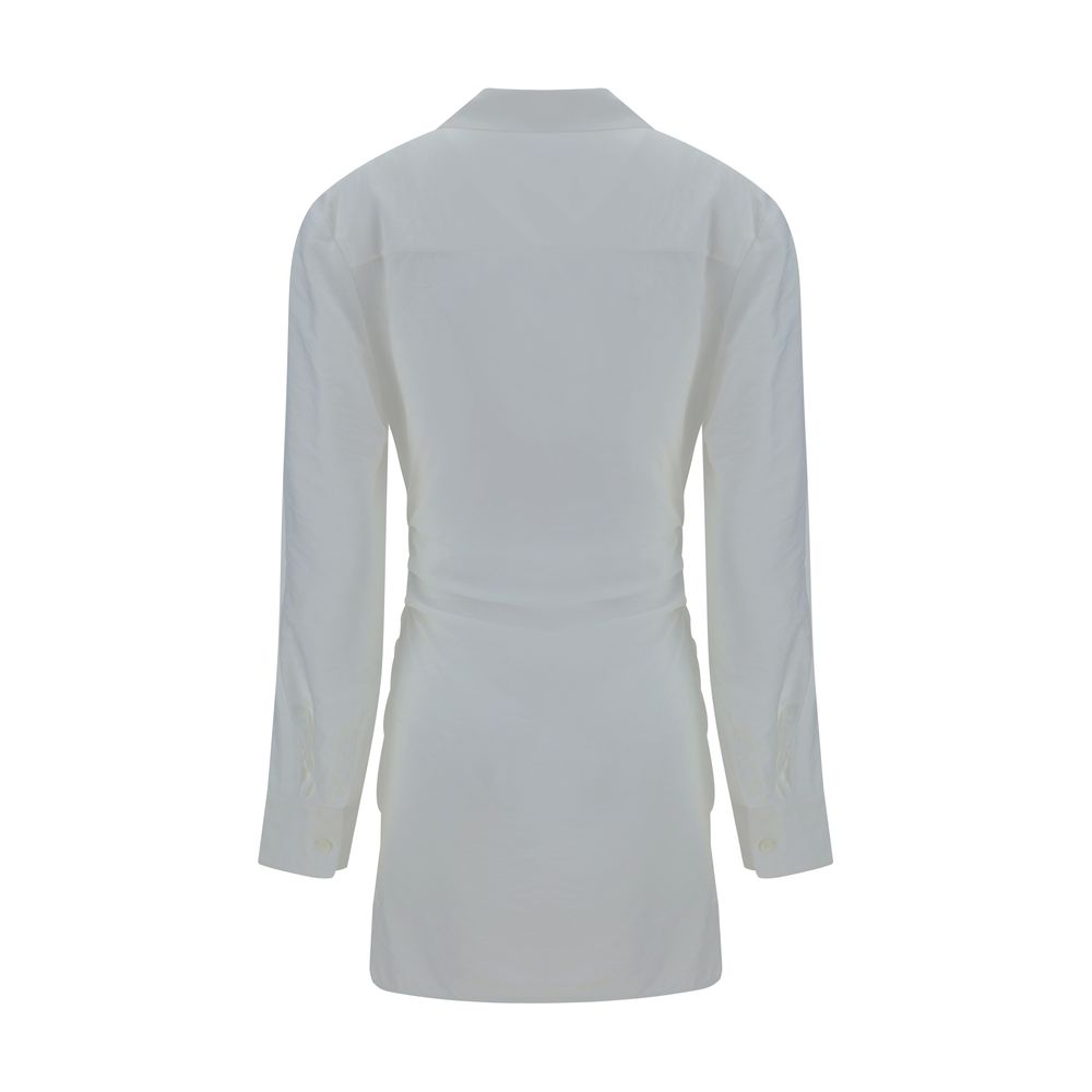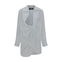 La Robe Bahia dress by Jacquemus, classic collar, wide asymmetric neckline, concealed button closure at the front with knotted smock detail at the waist, adjustable button cuffs, asymmetric hem, solid color pattern, regular fit.