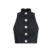 Das Crop-Top von Balmain ist ein auffälliges Kleidungsstück, das sich durch einen amerikanischen Ausschnitt und ein reiches Barockmuster auszeichnet. Die nackten Schultern betonen die Oberweite, während die dekorativen Metallknöpfe "Gold und Goldmünze" auf der Vorderseite einen ikonischen Touch verleihen. Die Rückseite wird mit einem freiliegenden Metallreißverschluss mit eingraviertem Balmain Paris-Schieber geschlossen - ein Detail, das die kühne Eleganz der Maison widerspiegelt.